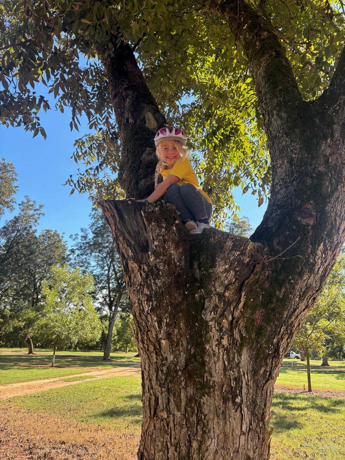 Meet Debbie and Pete's charming granddaughter, perched high in one of our prized pecan trees! With a twinkle in her eye and a helmet snug on her head, she’s the heart of our farm, where the sweetest pecans grow. Come shop our site and taste the magic of our pecan harvest—straight from her treetop kingdom!